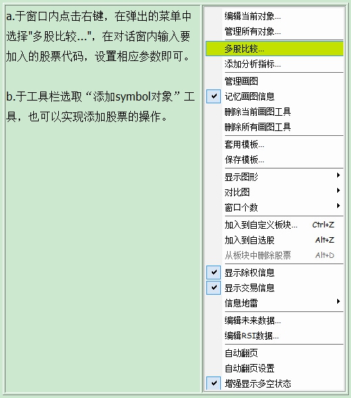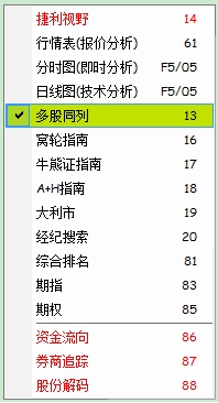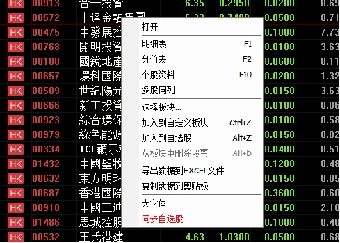 选中行情表中某个股,点鼠标右键,即出现对话窗,可选择"明细表"、"分价表"、"个股资料"、"、"多股同列"、"选择股票分组"、"同步股票分组"、"加入到板块"、"加入到自选股"等等