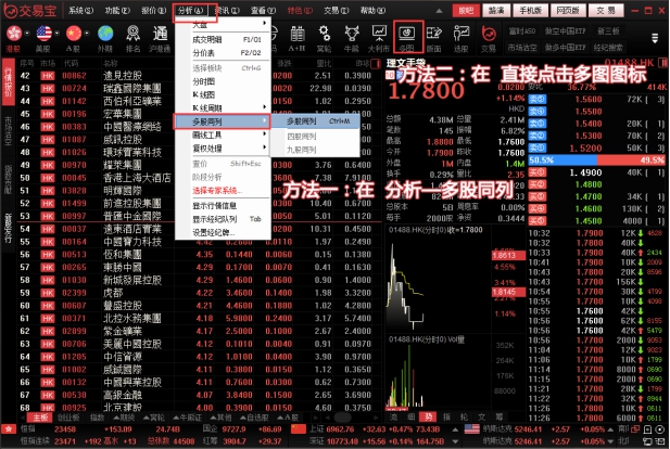 点击菜单栏中的“分析”下的“多股同列”;或者点击工具栏中的“多图"按钮可同时查看最多9只股票的走势图。
