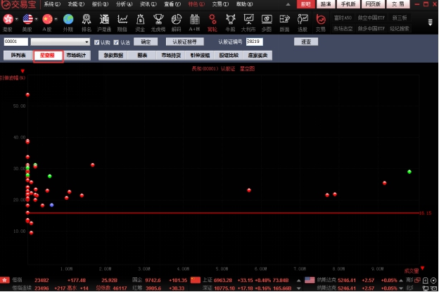 走势图窗口可选择察看:即时分析图,美国线(bar线)图、蜡烛图、收盘线、点数图、量价图、筹码分布图、量烛图等。提供多项技术分析指标; 可将多只股票图叠加比较;可查看多天图。