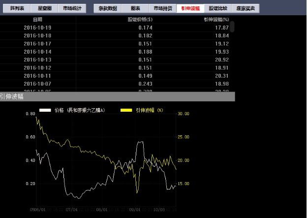引伸波幅图表中,黄色线是认股证走势,白色线是引伸波幅走势: