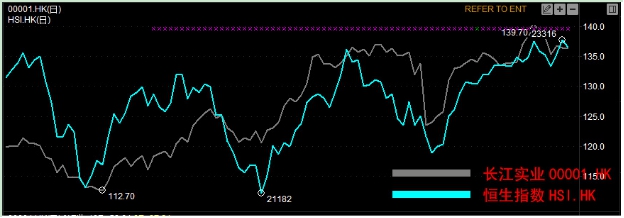 例如:要将00001长江实业与HSI恒生指数的走势比较。