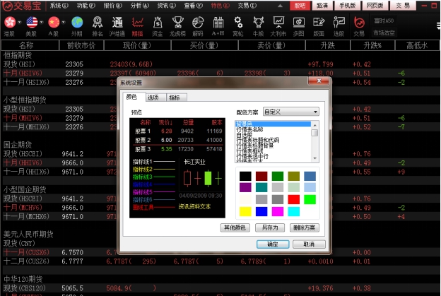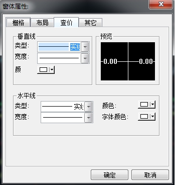 你可以选择预定义的四种不同的颜色模式,也可以自行调配颜色。字体、坐标线、走势线、查价线的颜色、线条粗细也可在此窗内编辑。