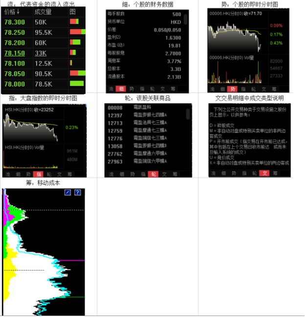 显示当前股票行情:代码、名称、现价、涨幅、涨跌、量比、昨收、今开、最高、总额、最低、总量、笔数、均价、震幅%、委差、委比%、买量、卖量、买价、卖价、内盘、外盘、涨速%、换手%、市值、每股净资、市盈(动)、股息、周息率。