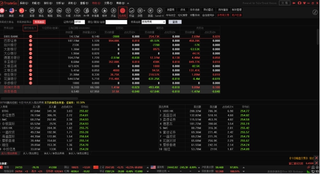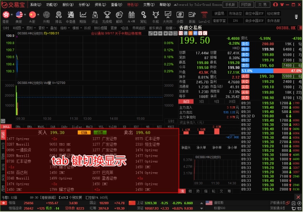 图表中底层显示即市买卖委托挂单之经纪牌,在灰色字体“买入”或“卖出”标题处单击,可切换显示经纪名称或经纪号码。