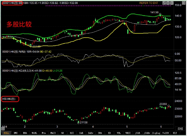 在窗口内点击鼠标右鍵,从弹出菜单中选择"多股比较",于对话窗内"组别"选择"港股","代码"中填入"HSI",设置走势图的相应参数,然后按"确定"。这时新加入的个股图形会显示在窗口的最下方。