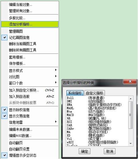 于窗口内点击右键,在弹出的菜单中选择"添加分析指标",在对话窗选择要添加的指标,设置相应参数即可。