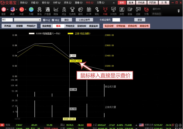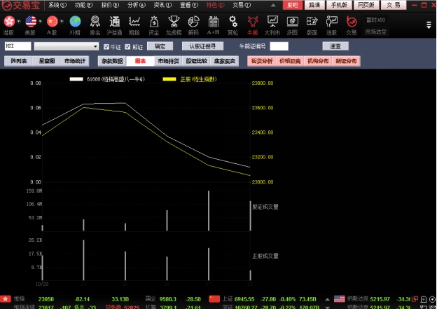 图表中,白色线是牛熊证走势,黄色线是正股走势,下面分别显示牛熊证成交量及正股成交量: