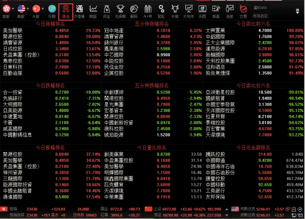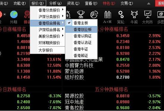 可在"报价"菜单>"香港综合排名"中选择切换股票、权证或牛熊证。
