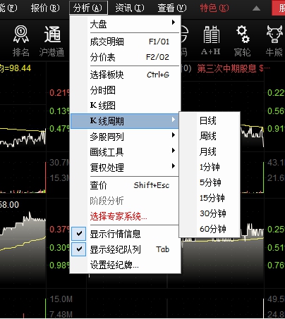 点击"分析"菜单>"K线周期",即是可调出日线K线图。K线周期分为:日线,周线,月线,1分钟,5分钟,15分钟,30分钟,60分钟选择图。