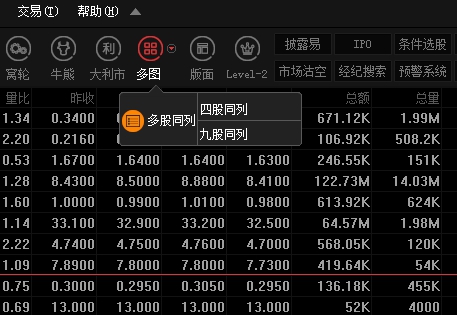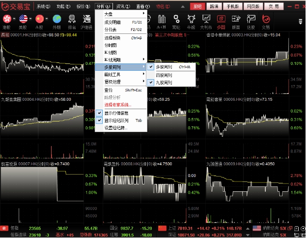 点击"分析"菜单>"多股同列",调出多图,可选择多股同列内容:选择板块、四股同列、九股同列及图表周期。