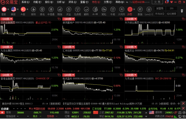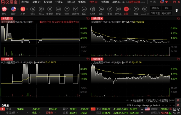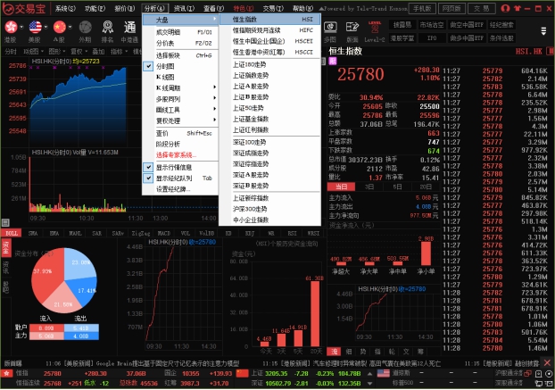 点击"分析"菜单>"大盘",可调出大盘指数走势图,可选恒生指数、恒指期货现月连续、恒生中国企业(国企)和恒生香港中资(红筹)。