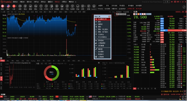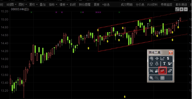 在股票走势图的右上角有一组工具按钮,点击第一个按钮“划线工具">"画图工具"菜单。