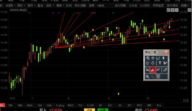 点击"分析"菜单>"画线工具">"江恩角度",对走势图进行江恩角度技术分析。