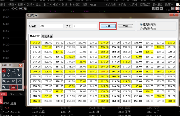点击"分析"菜单>"画线工具">"江恩矩阵",对走势图进行江恩矩阵技术分析。