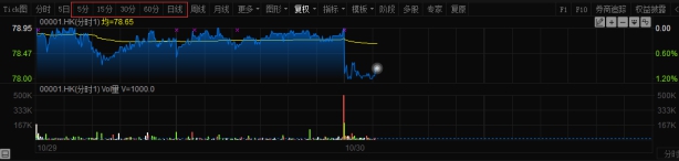 双击主界面的一支股票数据,即可进入显示该股票详细数据的界面,在该界面工具栏下有”分时”选择,分时分为:5分钟,15分钟,30分钟,60分钟,日线。