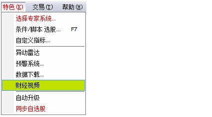 点击工具栏“特色”菜单,在弹出的二级菜单中选择“财经视频”